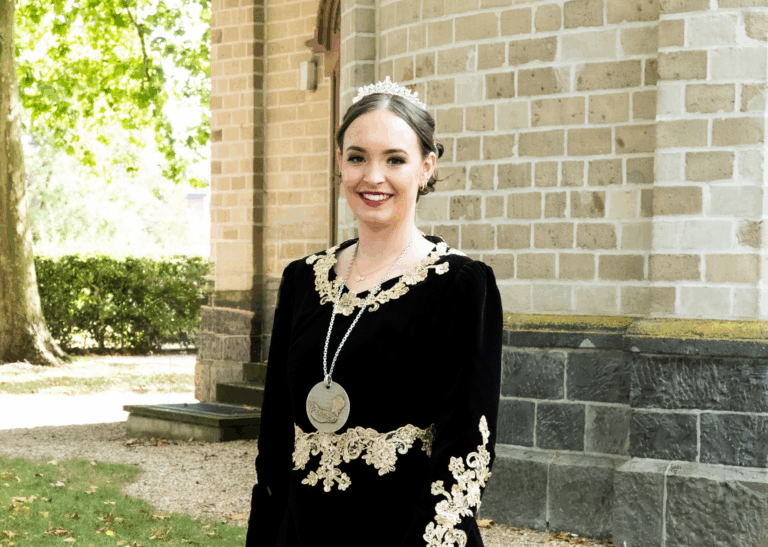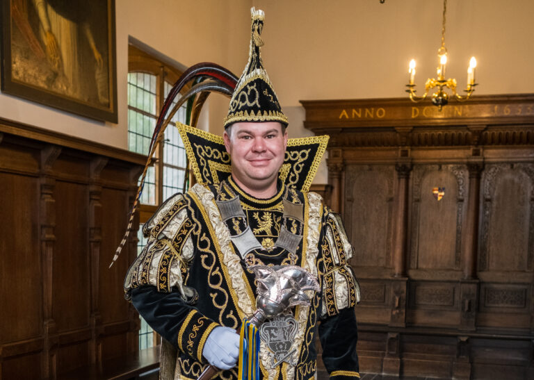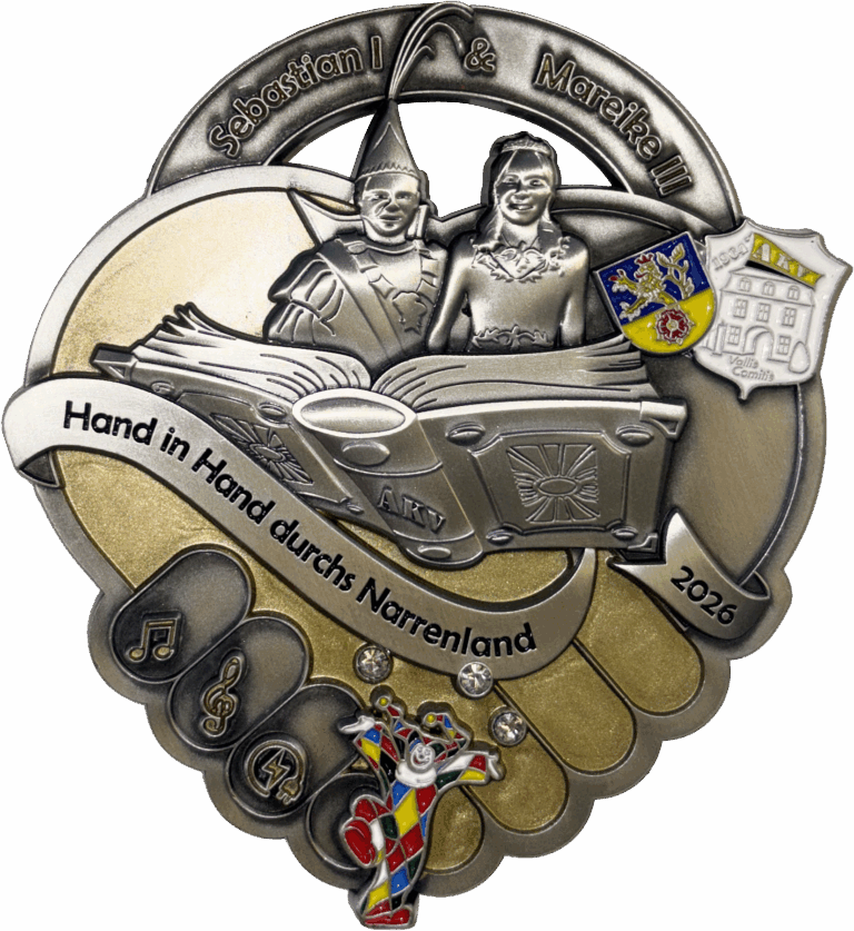 Der Prinzenorden zeigt als zentrales Element das fliegende Märchenbuch mit Sebastian und Mareike als Prinzenpaar. Es ist ein Symbol für die märchenhafte Reise durch die kommende Session. Vereins- und Stadtwappen betonen die Verbundenheit zu unserem Verein und zur Stadt Goch, während Note und Notenschlüssel sowie Blitz und Stecker persönliche Bezüge zum Hobby im Tambourcorps und zum Beruf des Elektrikers widerspiegeln.